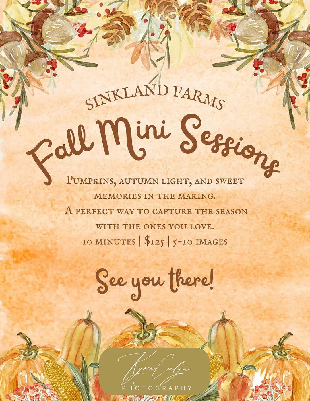 Kyra Calyn Photography will be offering fall mini sessions surrounded by the charm of Sinkland Farms — pumpkins, rolling hills, and that magical autumn light. The farm itself will be our backdrop, creating warm, timeless portraits full of seasonal charm.